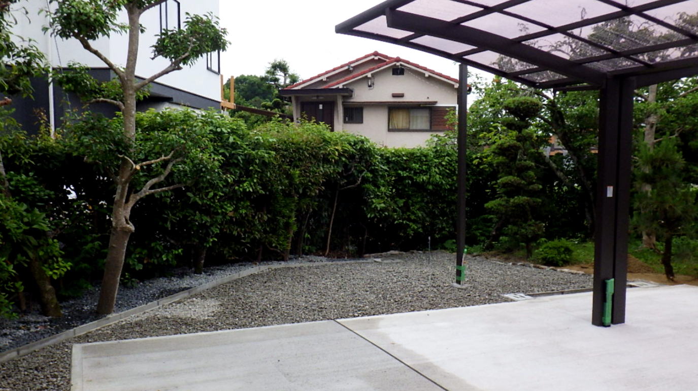 広い敷地とのバランスを考慮した屋根デザインを採用し、外構とリンクしたカーポートの出来上がりです。